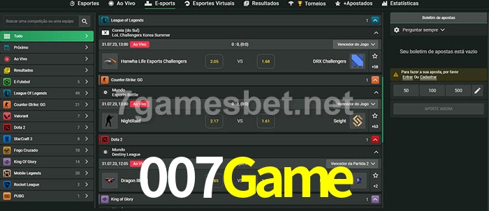 O 007Game oferece uma grande seleção de opções de apostas em e-sports com probabilidades competitivas